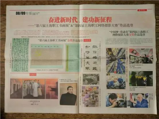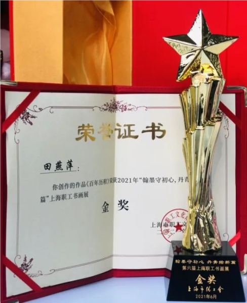 功夫不负有心人,经上海邮政工会选送,《百年历程》在上海市职工文体协会主办的“翰墨守初心 丹青绘新篇”上海职工书画展中斩获金奖,还登上《劳动报》专版。“作品聚焦新时代新气象新作为,展现了职工书画创作者对党的热爱之情和对艺术的不懈追求,以及奋进新征程、建功新时代的时代风貌。”评委会对此次获奖作品的评价正是田燕萍创作初心的真实写照。