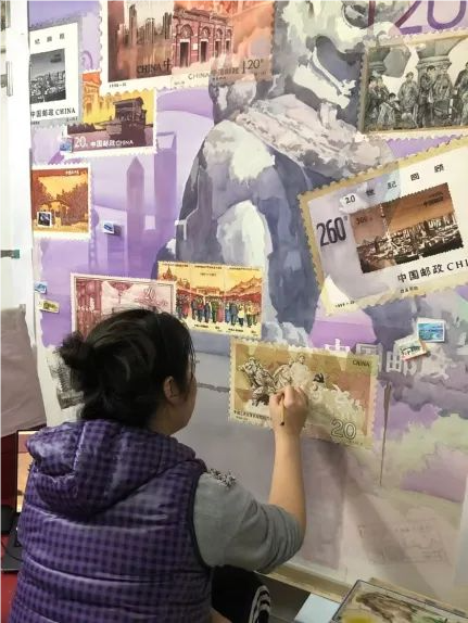 从邮票图案的细节还原,到色彩色调的精准把控,田燕萍始终追求用匠心打磨精品。她借鉴“蒙太奇”电影手法,用绘画串联起不同时代的邮票;背景特意绘制故宫石狮雕像,象征“苏醒的雄狮”;底色选用紫色,取“紫气东来”的吉祥寓意。每一处设计、每一笔勾勒,都藏着她对品质的追求。