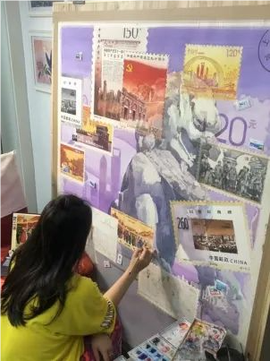 田燕萍秉持“邮票选得准,历史才有魂”的原则,在选取邮票时充分考量两个维度:既要紧扣中国共产党发展历程,又要融入上海当地元素。为找到合适的邮票,她前期做足了功课——向集邮专家借阅邮册梳理资料,一有空就去集邮市场“淘宝”;有时为了一枚邮票,不得不买下整版。虽经历无数次“折腾”,田燕萍却始终乐在其中。